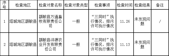 表1:2025年11月塔城地區(qū)生態(tài)環(huán)境局額敏縣分局生態(tài)環(huán)境執(zhí)法“雙隨機(jī)、一公開”抽查結(jié)果信息公開表