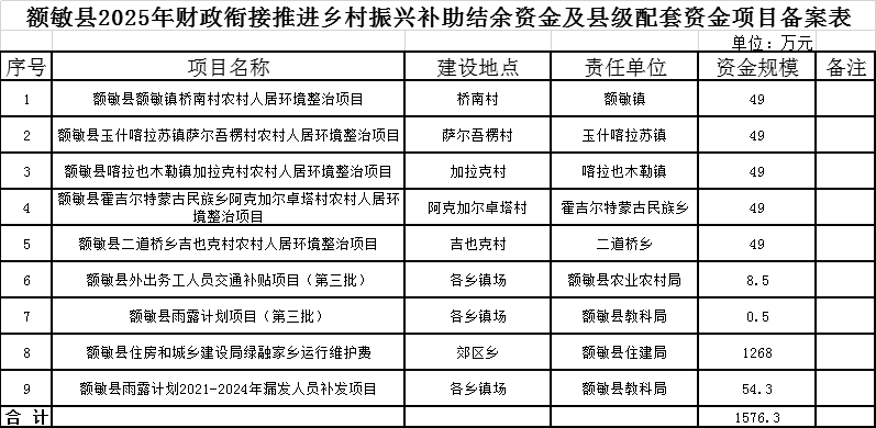 額敏縣2025年財(cái)政銜接推進(jìn)鄉(xiāng)村振興補(bǔ)助結(jié)余資金及縣級(jí)配套資金1576.3萬(wàn)元,現(xiàn)將有關(guān)資金安排使用情況公示如下: