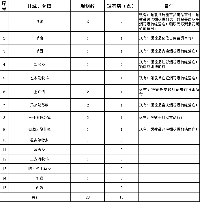 煙花爆竹零售店布點按照保障安全、統(tǒng)一規(guī)劃、合理布局、總量控制、適度競爭的原則,禁燃區(qū)域內(nèi)不設(shè)點,其他區(qū)域依照各鄉(xiāng)鎮(zhèn)(街道)人口密集程度、鄉(xiāng)鎮(zhèn)市場分布,結(jié)合歷年煙花爆竹零售店分布情況,便民利民等實際因素,做到既便于安全監(jiān)管、又便于群眾購買。全縣煙花爆竹零售店布點規(guī)劃如下: