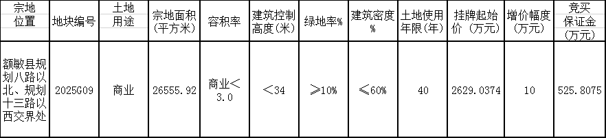 二、宗地出讓條件 此次掛牌出讓[2025G09]宗地價(jià)款中含土地使用權(quán)價(jià)款和地上附著物價(jià)款。競(jìng)得人競(jìng)得掛牌宗地后由競(jìng)得人自行拆除并承擔(dān)相關(guān)費(fèi)用,宗地規(guī)劃和建設(shè)要求嚴(yán)格按建設(shè)部門規(guī)劃執(zhí)行。 三、競(jìng)買人資格及要求 具有開發(fā)資質(zhì)的法人、其他組織和自然人均可參加競(jìng)買(法律另有規(guī)定的除外)。凡發(fā)現(xiàn)有拖欠土地出讓金及相關(guān)規(guī)費(fèi)行為的單位和個(gè)人均不得參加此次競(jìng)買活動(dòng)。 四、報(bào)名條件 單位參加競(jìng)買的持工商營業(yè)執(zhí)照副本原件、法定代表人身份證件(委托代理人憑授權(quán)委托書及代理人身份證件),同時(shí)攜銀行匯票于2025年6月11日至2025年6月30日到額敏縣自然資源局建設(shè)用地科申請(qǐng)報(bào)名。經(jīng)資格審查合格,按規(guī)定繳納競(jìng)買保證金后,方可參加競(jìng)買,同時(shí)取得額敏縣自然資源局國有建設(shè)用地使用權(quán)掛牌文件,逾期不接受報(bào)名。報(bào)名期間自然資源局組織現(xiàn)場(chǎng)踏勘,競(jìng)買人也可自行踏勘。本次掛牌不接受電話、郵寄及口頭競(jìng)買。 五、掛牌的時(shí)間、地點(diǎn) 2025年6月11日上午11時(shí)在額敏縣自然資源局六樓交易大廳進(jìn)行掛牌,此次掛牌期限為30天(含節(jié)假日),截止時(shí)間為2025年7月10日上午11時(shí)整。掛牌期限屆滿,如仍有兩個(gè)以上競(jìng)買人的,掛牌主持人現(xiàn)場(chǎng)宣布最高報(bào)價(jià)及其報(bào)價(jià)者,并詢問其他競(jìng)買人是否愿意繼續(xù)競(jìng)價(jià),有競(jìng)買人愿意繼續(xù)競(jìng)價(jià)的,掛牌出讓轉(zhuǎn)入現(xiàn)場(chǎng)詢價(jià),通過現(xiàn)場(chǎng)詢價(jià)確定競(jìng)得人。 六、宗地競(jìng)買及交付土地出讓金方式 1.本次宗地掛牌以增價(jià)方式競(jìng)價(jià),宗地[2025G09]每次增價(jià)幅度為10萬元。 2.本次宗地掛牌以最高價(jià)競(jìng)得,并經(jīng)確認(rèn)的競(jìng)買人為競(jìng)得人,掛牌出讓宗地在掛牌期間,出讓人可根據(jù)競(jìng)買人的競(jìng)價(jià)情況調(diào)整增價(jià)幅度,競(jìng)買者在滿足掛牌文件要求的情況下可多次報(bào)價(jià),報(bào)價(jià)高者競(jìng)得。 3.競(jìng)得人繳納的履約保證金由額敏縣自然資源局存入銀行專戶,履約保證金可充抵土地出讓金。未競(jìng)得土地使用權(quán)者,掛牌結(jié)束5個(gè)工作日內(nèi)退還履約保證金(不計(jì)利息)。 競(jìng)買人競(jìng)得宗地后,按照合同內(nèi)約定時(shí)間付清全部價(jià)款(含保證金),并承諾在簽訂《掛牌成交確定書》之日起依照《國有建設(shè)用地使用權(quán)出讓合同》的約定,付清全部價(jià)款項(xiàng)和繳納應(yīng)繳稅費(fèi)后方可申請(qǐng)辦理國有建設(shè)用地使用權(quán)登記手續(xù)。(詳見掛牌出讓文件)。 七、競(jìng)買人競(jìng)得宗地后,按出讓金20%繳納用地保證金,如在建設(shè)用地過程中未按出讓合同簽訂的用地面積、用途使用土地的,保證金不予退還,并按相關(guān)法律法規(guī)處理。 八、本次掛牌出讓的有關(guān)事宜如有變更,出讓人將在掛牌日結(jié)束3日前在中國土地市場(chǎng)網(wǎng) 九、聯(lián)系電話: 聯(lián)系人:賽先生、闞先生 額敏縣自然資源局 2025年6月11日