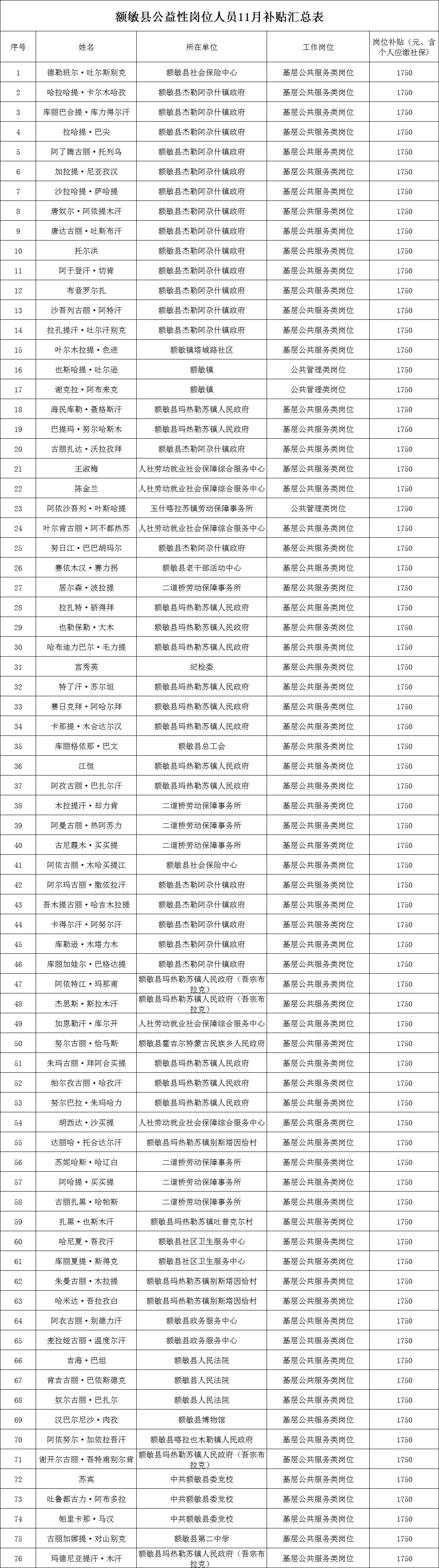 按照《新疆維吾爾自治區(qū)就業(yè)資金管理暫行辦法》(新財(cái)社〔2018〕241號(hào))、《關(guān)于進(jìn)一步做好公益性崗位開發(fā)管理有關(guān)工作的通知》(新人社發(fā)〔2020〕8號(hào))相關(guān)要求,現(xiàn)對(duì)額敏縣2025年11月份公益性崗位人員社保補(bǔ)貼予以公示。