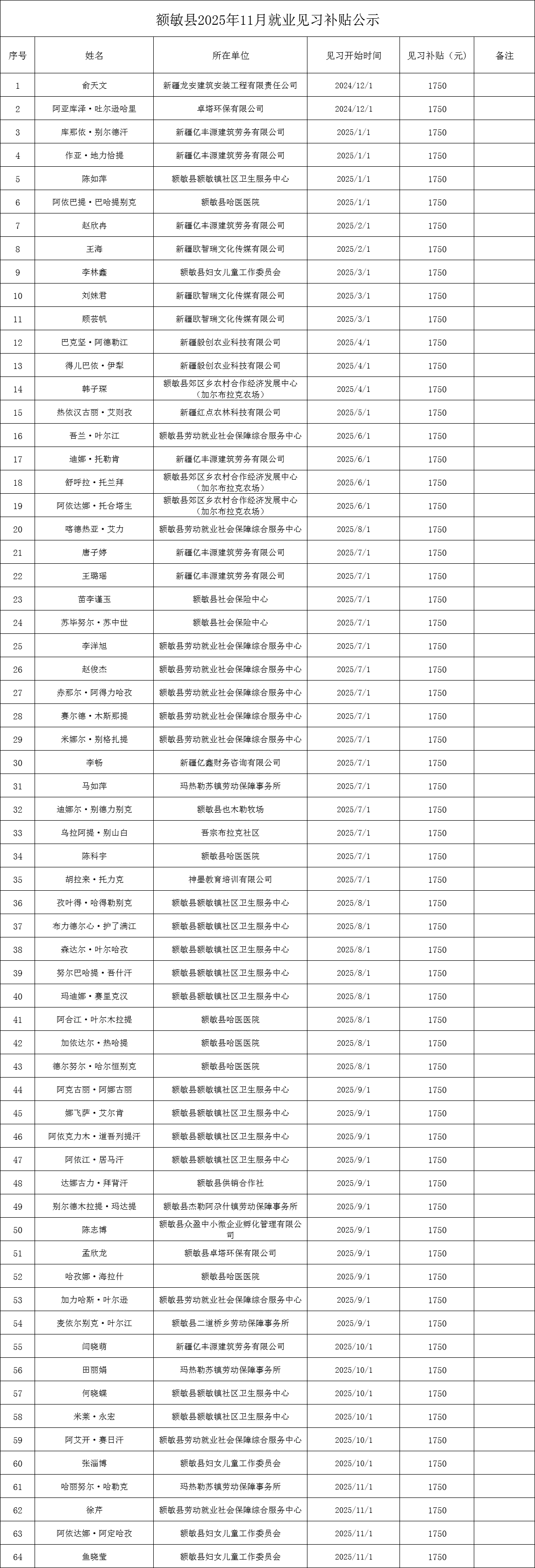 按照《關(guān)于實(shí)施就業(yè)見(jiàn)習(xí)崗位募集計(jì)劃的通知》(新人社發(fā)〔2023〕51號(hào))、《新疆維吾爾自治區(qū)就業(yè)資金管理暫行辦法》(新財(cái)社〔2018〕241號(hào))要求,現(xiàn)對(duì)額敏縣2025年11月份見(jiàn)習(xí)補(bǔ)貼予以公示。