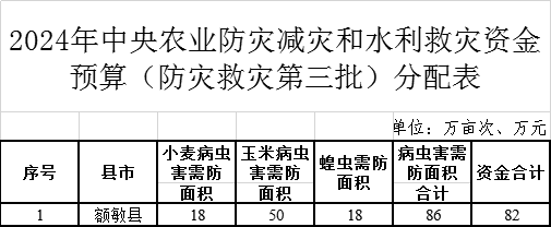 2024年,上級(jí)下達(dá)額敏縣2024年中央農(nóng)業(yè)防災(zāi)減災(zāi)和水利救災(zāi)資金(防災(zāi)救災(zāi)第三批)82萬(wàn)元,現(xiàn)將有關(guān)資金安排使用情況公示如下: