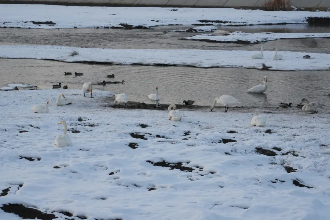 額敏縣對(duì)額敏河生態(tài)保護(hù)高度重視,實(shí)施生態(tài)補(bǔ)水工程,清理廢棄物,新建蓄水池,冬季為天鵝清掃積雪、開(kāi)辟覓食通道等措施,為鳥(niǎo)類(lèi)提供了適宜的棲息場(chǎng)所。因此,人與天鵝也建立起了信任。