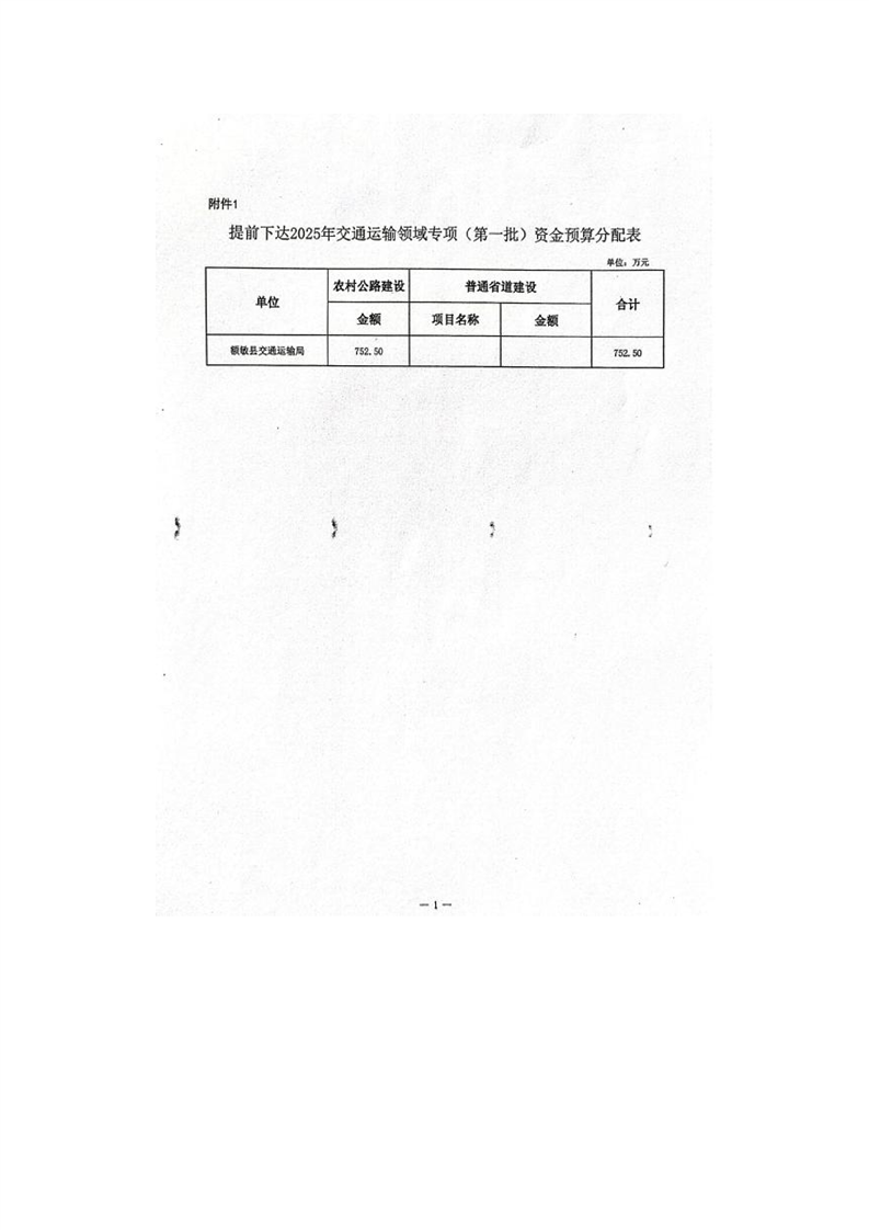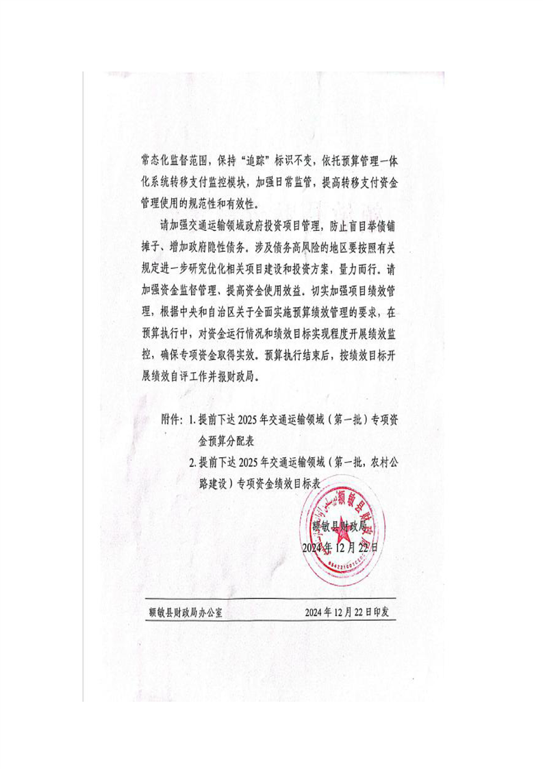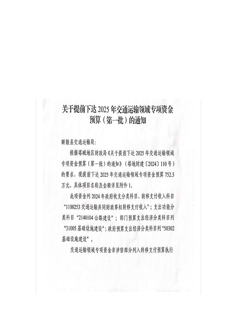 關(guān)于提前下達2025年交通運輸領(lǐng)域?qū)m椯Y金預(yù)算(第一批)的通知