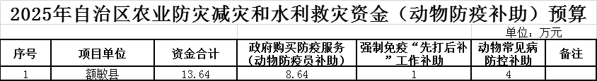 2024年,上級提前下達額敏縣2025年自治區(qū)農(nóng)業(yè)防災(zāi)減災(zāi)資金(動物防疫補助)13.64萬元,現(xiàn)將有關(guān)資金安排使用情況公示如下: