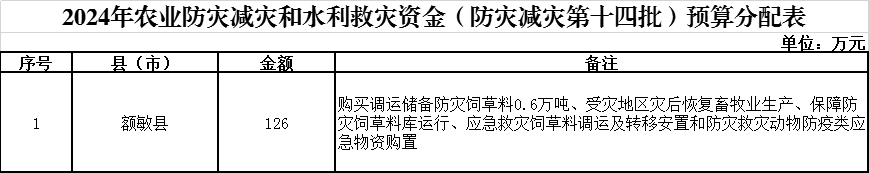 額敏縣2024年中央農(nóng)業(yè)防災(zāi)減災(zāi)和水利救災(zāi)資金(防災(zāi)救災(zāi)第十四批)126萬元。
