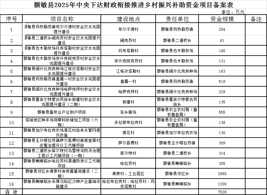 額敏縣2025年中央財(cái)政銜接推進(jìn)鄉(xiāng)村振興補(bǔ)助資金7526萬(wàn)元。