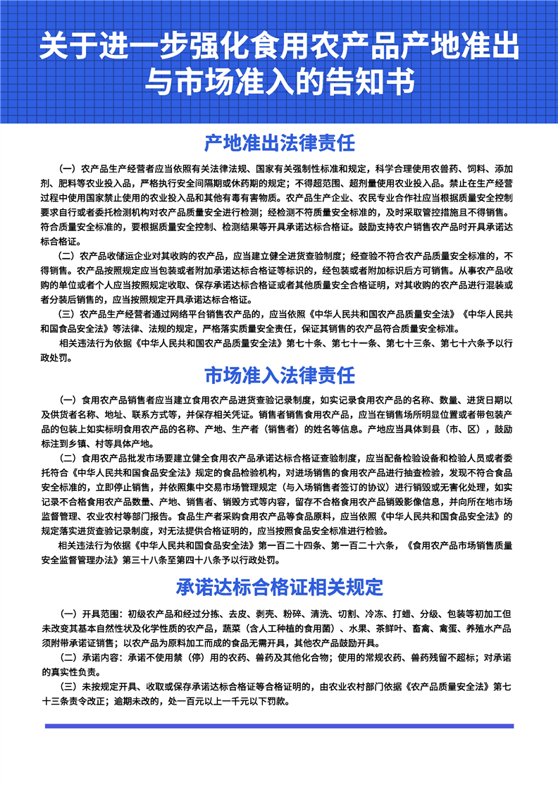 關(guān)于進一步加強食用農(nóng)產(chǎn)品產(chǎn)地準出與市場準入銜接工作的告知書