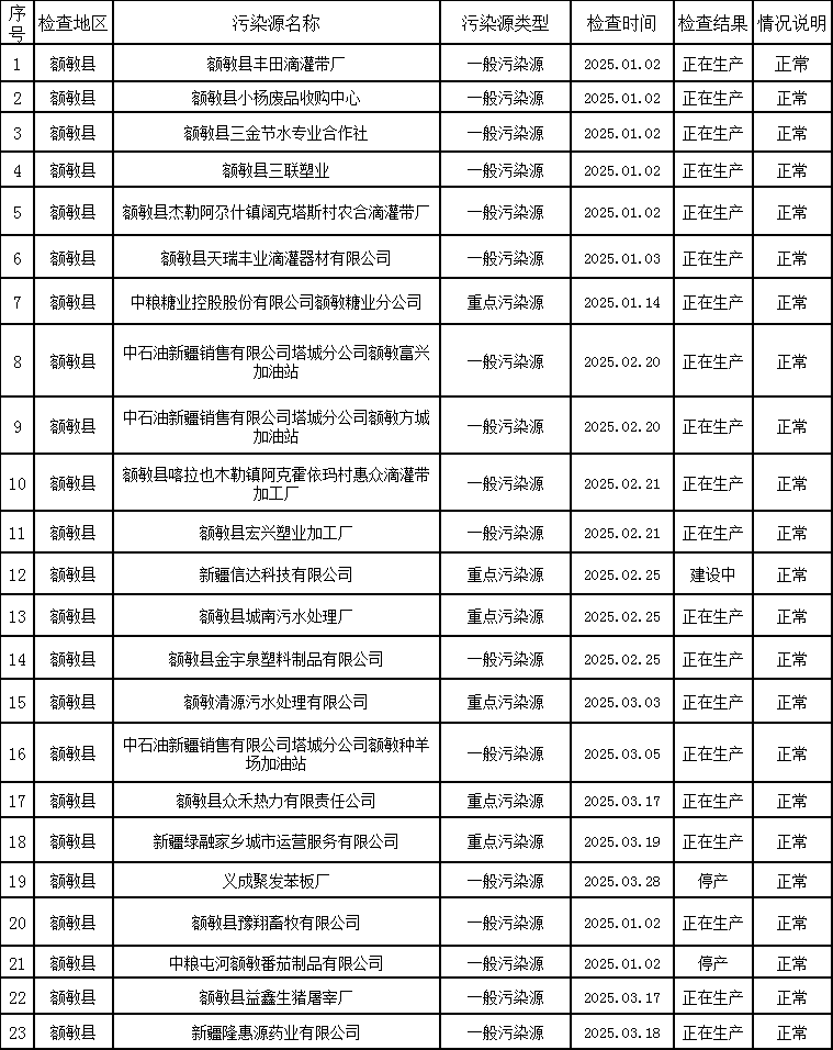 2025年1月至3月,額敏縣生態(tài)環(huán)境局組織開(kāi)展額敏縣重點(diǎn)污染源日常環(huán)境監(jiān)管領(lǐng)域隨機(jī)抽查檢查工作,抽取重點(diǎn)污染源共6家、一般污染源17家,現(xiàn)將具體信息公開(kāi)如下: