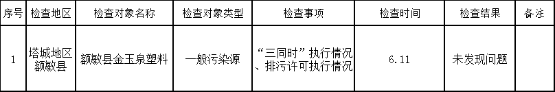 表1:2025年6月塔城地區(qū)生態(tài)環(huán)境局額敏縣分局生態(tài)環(huán)境執(zhí)法“雙隨機、一公開”抽查結(jié)果信息公開表