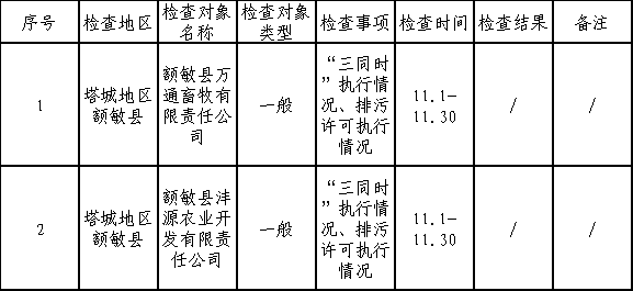 2025年11月1日至11月30日,塔城地區(qū)生態(tài)環(huán)境局額敏縣分局組織開展生態(tài)環(huán)境執(zhí)法“雙隨機(jī)、一公開”監(jiān)管工作,現(xiàn)將具體信息公開如下: