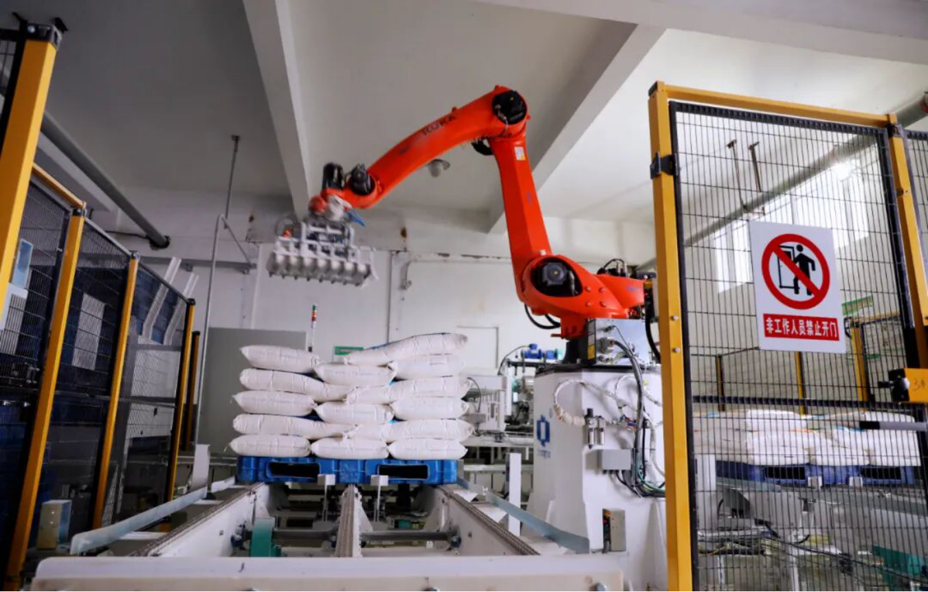 新疆塔城儲綠糧油集團(tuán)面粉加工有限公司車間機(jī)械碼放包裝好的面粉。