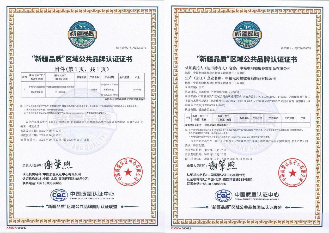 中糧屯河額敏番茄制品有限公司負責人表示:“此次獲得‘新疆品質(zhì)’認證,是對我們產(chǎn)品質(zhì)量和管理水平的充分肯定。我們將始終堅持質(zhì)量為先、誠信經(jīng)營的理念,持續(xù)提升生產(chǎn)技術和工藝水平,嚴控從原料到成品的每一個環(huán)節(jié),為全球消費者提供安全、優(yōu)質(zhì)、營養(yǎng)的番茄制品,擦亮‘新疆品質(zhì)’金字招牌。”